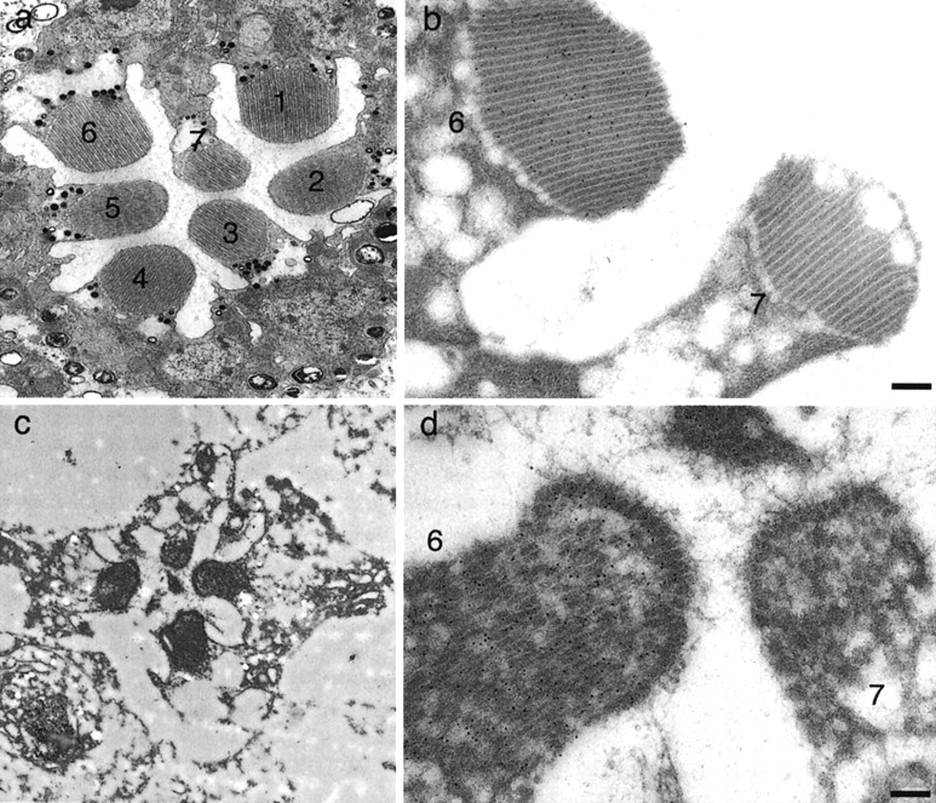 Thin sections through a single ommatidium from a wild-type or mutant Drosophila eye, immunolabeled for rhodopsin. The eyes were fixed in 3% glutaraldehyde, osmicated, and embedded in Spurr’s resin (a,b; wild-type) or fixed in 4% formaldehyde and embedded in LR White (c,d; mutant). (a) Each ommatidium contains seven rhabdomeres. (b) Rhabdomeres 1-6 express rhodopsin, while rhabdomere 7 does not. (c) In the mutant eye, ommatidia are deleted or altered. (d) The rhabdomeres are also structurally altered, but their staining pattern for rhodopsin remains unchanged, with no expression of rhodopsin in rhabdomere 7. Bars, 200 nm. (Reprinted with permission from Scion Publishing Ltd. © 2006.)