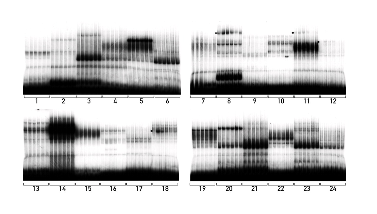 Four typical gels from a DDDP screen. Each autoradiograph displays groups of EMSAs performed on six nuclear extracts harvested from mouse livers at 4-h intervals over a 24-h period with six random DNA probes each (labeled 1-24). Prominent differences in DNA-binding activities were identified with probes 8, 11, 12, and 18 (asterisks).