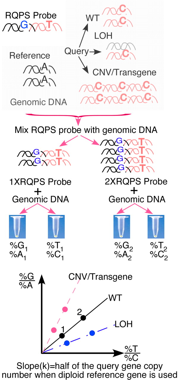 Principle of RQPS. The RQPS probe consists of two physically linked DNA fragments. One matches a reference allele with known CNs in a genome (black) and the other the query allele (pink). Each has a SNV to differentiate it from its counterparts in the genome (G vs. A for the reference and T vs. C for the query in this example). When different amounts of probe and genomic DNA are mixed, their molar ratio can be determined by quantitative pyrosequencing of either the reference (%G/%A) or the query (%T/%C) SNV. The value of this ratio will be equal (%G/%A=%T/%C) if the CN of the query allele equals that of the reference allele. Otherwise, they will be unequal. Specifically, when %G/%A is plotted against %T/%C, a line through the origin (0, 0) is expected, and the CN of the query gene equals the product of the slope of this line and the CN of the query gene. (Reprinted from Liu et al. 2009.)