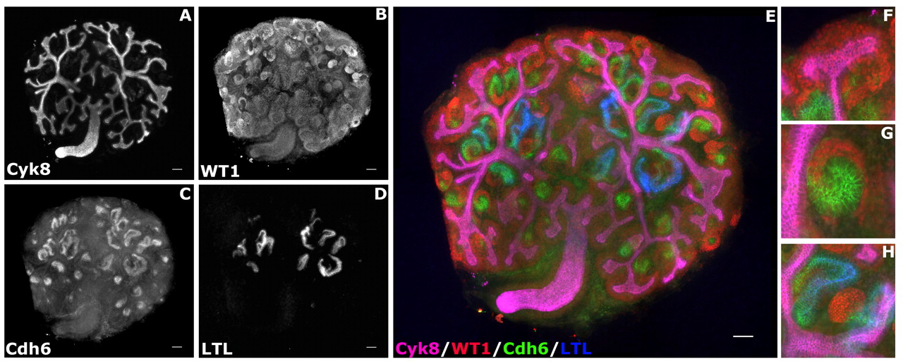 Representative four-color immunohistochemistry of cultured kidneys. (A-D) Black and white images of the four markers used in this study. (A) Cytokeratin 8, ureteric bud/collecting duct. (B) WT1, metanephric mesenchyme, podocytes. (C) Cadherin 6, immature and mature proximal tubules. (D) LTL, mature proximal tubules. (E) Four-color merged image of A-D. (F-H) High-magnification images of various stages of nephron formation. WT1-positive nephron stem cells surround the branched ureteric bud tips (F). These stem cells undergo mesenchyme-to-epithelium transition (MET) to form early nephrons with distinct segments (G). Continued growth and differentiation result in segmented tubular epithelium patterned along a proximo-distal axis (H). Scale bar = 100 microns.
