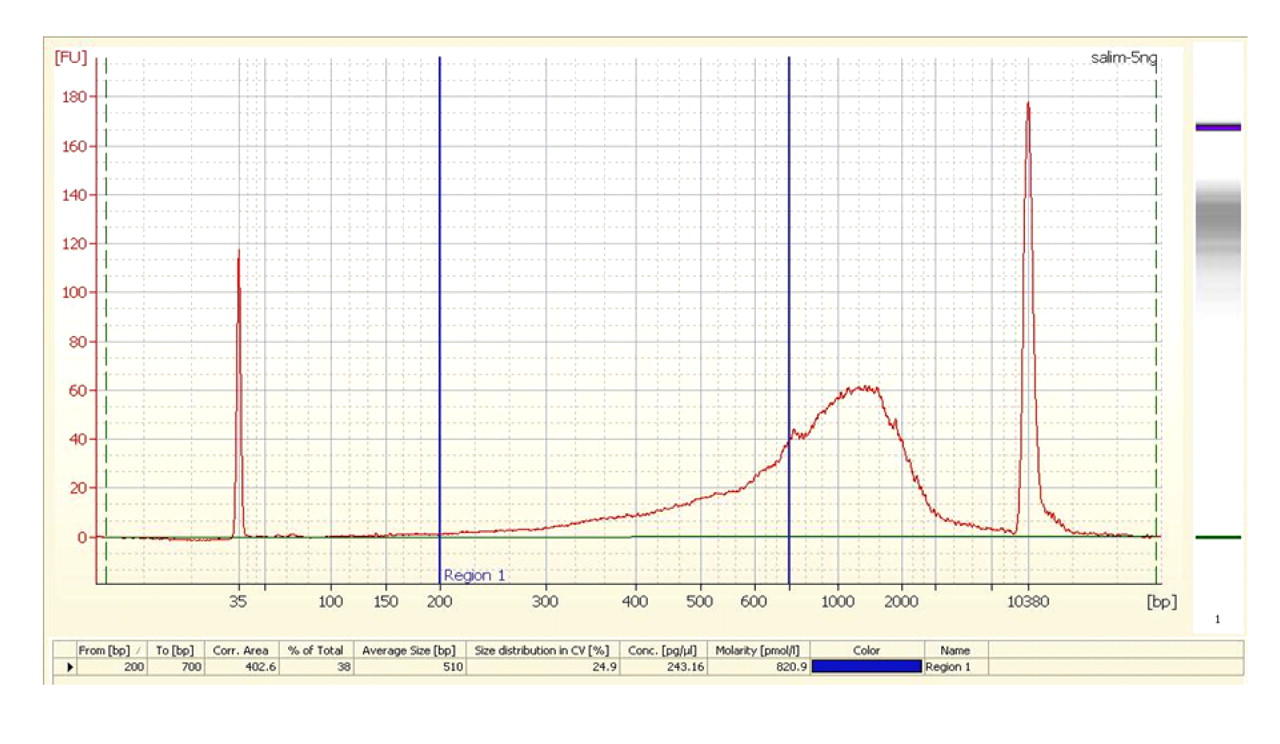 Bioanalyzer profile of a typical nanoCAGE library (5 ng/μL). This protocol assumes that only cDNAs in the 200-700-bp range are sequenced efficiently. Longer templates are likely to be outcompeted by shorter ones for binding to the flow cell; they also could be difficult to amplify using the bridge PCR.