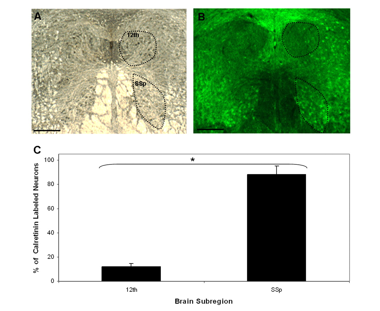 Immunohistochemical validation of calretinin expression in the 12th and SSp motor nuclei. (A) Darkfield coronal section of male zebra finch brainstem. (B) The same section as in A under fluorescence imaging shows calretinin expression (green) detected by a fluorescein isothiocyanate (FITC)-labeled calretinin-specific antibody. (C) Quantitative analysis of calretinin- expressing cells. The total number of motor neurons was determined from darkfield images; the number of calretinin-labeled neurons was determined from FITC fluorescence images. There are nine times as many calretinin-positive neurons in the SSp motor nucleus as there are in the 12th motor nucleus (n = 3; [*] p < 0.003). Scale bars, 500 μm.