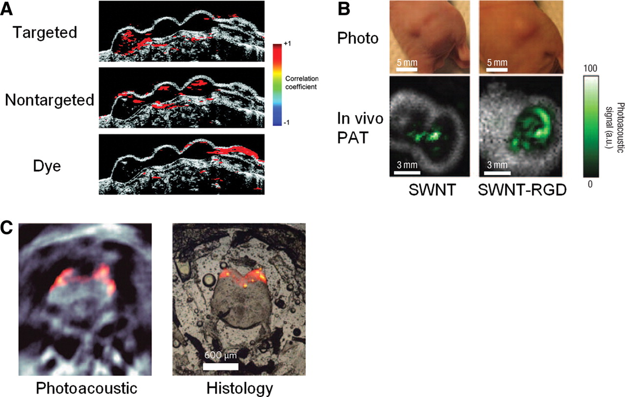 Molecular photoacoustic imaging. (A) Correlation coefficient images, obtained by comparing multiwavelength photoacoustic images with optical spectra of targeted gold nanoparticles, nontargeted gold nanoparticles, and a dye, overlaid on ultrasound images of the subcutaneous gelatin implants in mouse tissue ex vivo. Only correlation coefficient values >0.75 were displayed in the images. Images measure 44 mm laterally and 9.1 mm axially. (B) Photographs of the tumors in mice and the corresponding photoacoustic subtraction images (green) shown as horizontal slices through the tumors. (C) (Left) Photoacoustic image of the zebrafish brain with fluorescent protein expression shown in color. (Right) Corresponding histology of a dissected fish. See text for details. (Adapted from De la Zerda et al. 2008, with permission from Macmillan © 2008, adapted from Mallidi et al. 2009, with permission from American Chemical Society © 2009, and adapted from Razansky et al. 2009, with permission from Macmillan © 2009.)