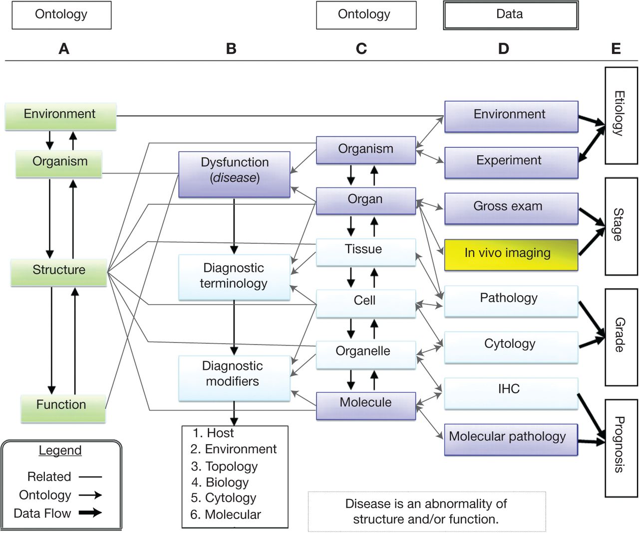 The ontogeny of disease. This ontology illustrates the complex relationships among structure, function, data sources, and diagnostic terminology (words used in diagnosis). It is based on the Rosse Foundational Anatomy ontology (Rosse and Mejino 2003; Cardiff et al. 2004). It shows the information required to understand microscopic pathology within the context of disease. The ontological structure provides an organ-based hierarchy with levels of anatomic organization to describe structure. The color in the boxes indicates the sources of the information: investigators (violet), imagers (yellow), and pathologists (light blue). Column A emphasizes normal relationships between organism, structure, and function. Column B demonstrates the relationship between the levels of organization and diagnostic nomenclature. Information is gathered from many levels of structure and function (column C). The pathologist's interpretation of the structure integrates all of the clinical, functional, and structural information (column D). Column E indicates the level of information used to decide the different clinical features of tumors in human medicine. The connecting lines indicate the relationships and flow of information (data) that provide context for the “diagnosis.” The diagnosis is primarily descriptive and adheres to standard terminology. However, as pathologists integrate more sophisticated data sources, the data must be recorded as “diagnostic modifiers.” If pathologists and scientists will adhere to this, or similar, ontology, computers and informatics will enable the scientific community to organize their data sets and recognize the relationships (“map”) across species. Investigators and pathologists will need to recognize and understand their roles in the organizational scheme to share data sources. This is our challenge and our responsibility.