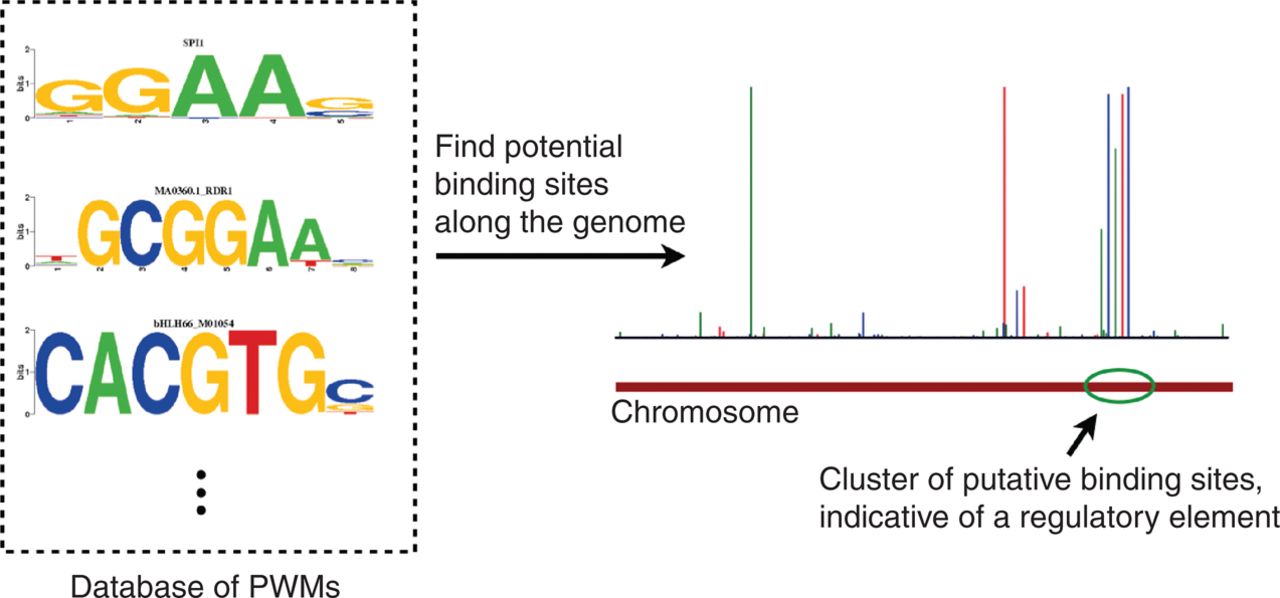 Using position weight matrices (PWMs) to identify transcription factor binding sites. The genomic region of interest is scanned with known binding preferences of transcription factors to find potential binding sites. The spatial distribution of these predicted binding sites is used to identify regulatory elements.