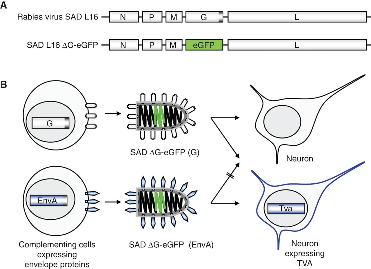 (A) Organization of the recombinant rabies virus (RV) RNA genome. The 12-kb RNA of RV (SAD L16) encodes five proteins—nucleoprotein (N), phosphoprotein (P), matrix protein (M), glycoprotein (G), and the RNA polymerase (L). N, P, L, and RNA are associated with the viral ribonucleoprotein (RNP); M forms a layer connecting the RNP with the lipid bilayer membrane; and G is a trimeric type I transmembrane spike protein mediating attachment of the virus to cell receptors and membrane fusion. SAD ΔG-eGFP lacks a G gene and encodes eGFP (enhanced green fluorescent protein) instead. (B) Pseudotyping of G gene-deficient virus. To yield virus particles able to infect cells, the G deficiency of SAD ΔG-eGFP must be complemented in cells expressing an analogous glycoprotein (i.e., a protein that binds to a receptor and mediates membrane fusion). For effective incorporation of heterologous proteins, such as the retroviral EnvA, their carboxy-terminal domains should be exchanged with that of G. As EnvA has a highly specific avian receptor (TVA), EnvA-pseudotyped RV infects only mammalian cells engineered to express TVA.