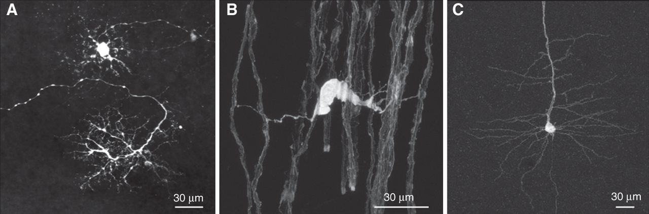 Examples of infection of diverse cells types by SAD ΔG-eGFP (G). (A) Horizontal cells in an explanted mouse retina. (Courtesy of Botond Roska, Friedrich Miescher Institute, Basel.) (B) Oligodendrocyte after injection of SAD ΔG-eGFP (G) into the spinal cord. (C) Layer V neuron in neocortex. (B,C, Courtesy of Martin Kerschensteiner, Ludwig-Maximilians-University, Munich and Thomas Misgeld, Technical University, Munich.)