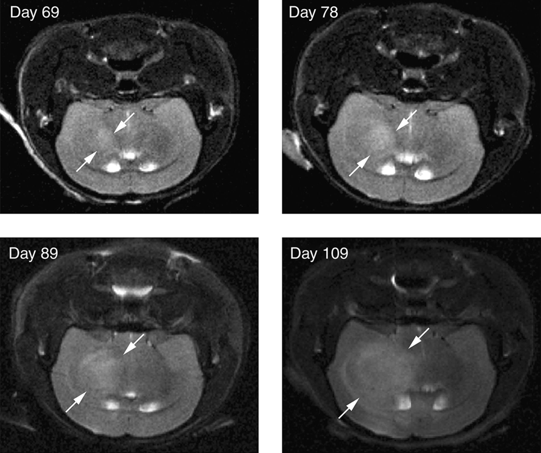MRI of orthotopic brain tumors. Primary human glioblastoma multiforme cells were stereotactically implanted into the brains of mice. MRI imaging shows progressive growth of primary orthografts at the indicated time after implantation. The tumor (boundary indicated by arrows) is distinguishable from surrounding brain tissue on the basis of T2 hyperintensity (transverse relaxation).