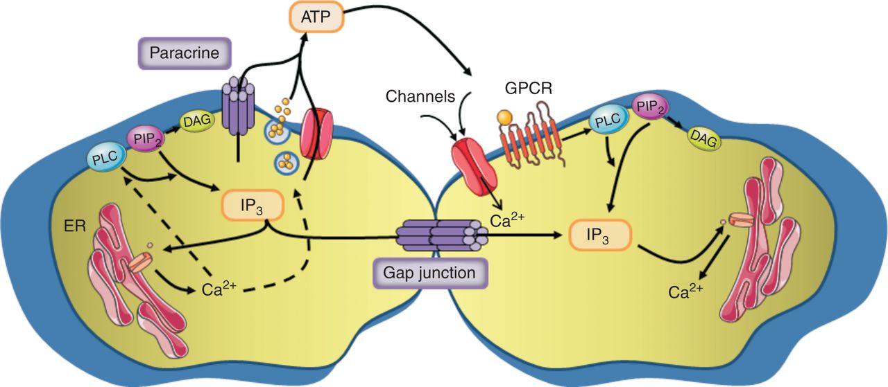 Mechanisms underlying the propagation of intercellular Ca2+ waves. Ca2+ waves can be propagated by the intercellular transfer of signaling molecules, such as IP3, through gap junctions. The extracellular pathway involves the release of different molecules, primarily ATP, via hemichannels, a vesicular pathway, or channels such as the P2X7 receptor. ATP diffuses to neighboring cells where it activates GPCRs or Ca2+-entry channels, thereby increasing [Ca2+]i. Regenerative mechanisms (activation of PLC or stimulation of ATP release mechanisms) are indicated by the dashed arrows.