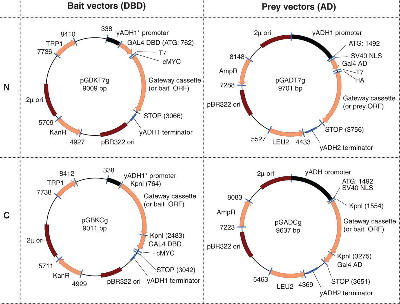Selected bait and prey vectors. The pGBKT7g and pGADT7g generate amino-terminal DBD and AD fusions, respectively. pGBKCg and pGADCg fuse the DBD or AD at the carboxyl terminus of inserted ORF. (Reprinted from Stellberger et al. 2010.)