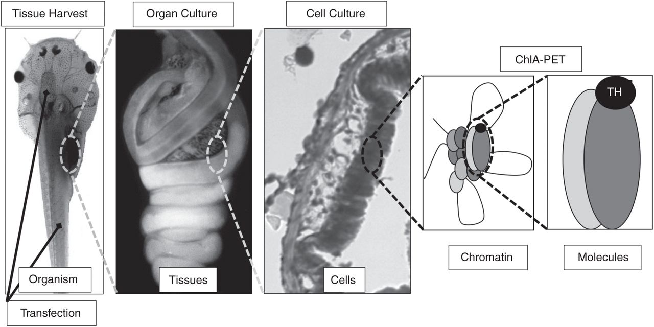 Levels of analysis of the Xenopus model to elucidate mechanisms of hormonal control of development. From left to right, the figure panels show decreasing biological levels from organism (tadpole) to tissues (whole intestine), cells (intestinal cross-section), chromatin structure (chromosomal looping) and molecules (receptor-hormone interaction, thyroid hormone [TH] bound to its nuclear receptor). The focal biological levels queried by the protocols introduced here are indicated. For tissue harvest, see Protocol: Xenopus Tadpole Tissue Harvest (Patmann et al. 2017); for transfection, see Protocol: Bulk Electroporation-Mediated Gene Transfer into Xenopus Tadpole Brain (Sáenz de Miera et al. 2018) and Protocol: In Vivo Transfection of Naked DNA into Xenopus Tadpole Tail Muscle (Marshall et al. 2017); for organ culture, see Protocol: Organ Culture of the Xenopus Tadpole Intestine (Ishizuya-Oka 2017); for cell culture, see Protocol: Cell Proliferation Analysis During Xenopus Metamorphosis: Using 5-Ethynyl-2-Deoxyuridine (EdU) to Stain Proliferating Intestinal Cells (Okada and Shi 2017); for ChIA-PET, see Protocol: Chromatin Immunoprecipitation for Chromatin Interaction Analysis Using Paired-End-Tag (ChIA-PET) Sequencing in Tadpole Tissues (Buisine et al. 2018a) and Protocol: Chromatin Interaction Analysis Using Paired-End-Tag (ChIA-PET) Sequencing in Tadpole Tissues (Buisine et al. 2018b).