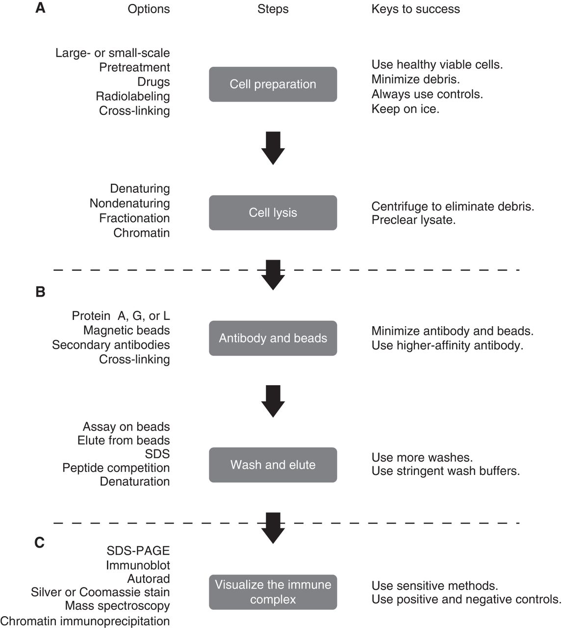 Immunoprecipitation experimental strategies. (A) The preparatory phase, (B) the antibody–antigen complex, and (C) the immune complex detection phase. (SDS) Sodium dodecyl sulfate; (SDS–PAGE) sodium dodecyl sulfate polyacrylamide gel electrophoresis.