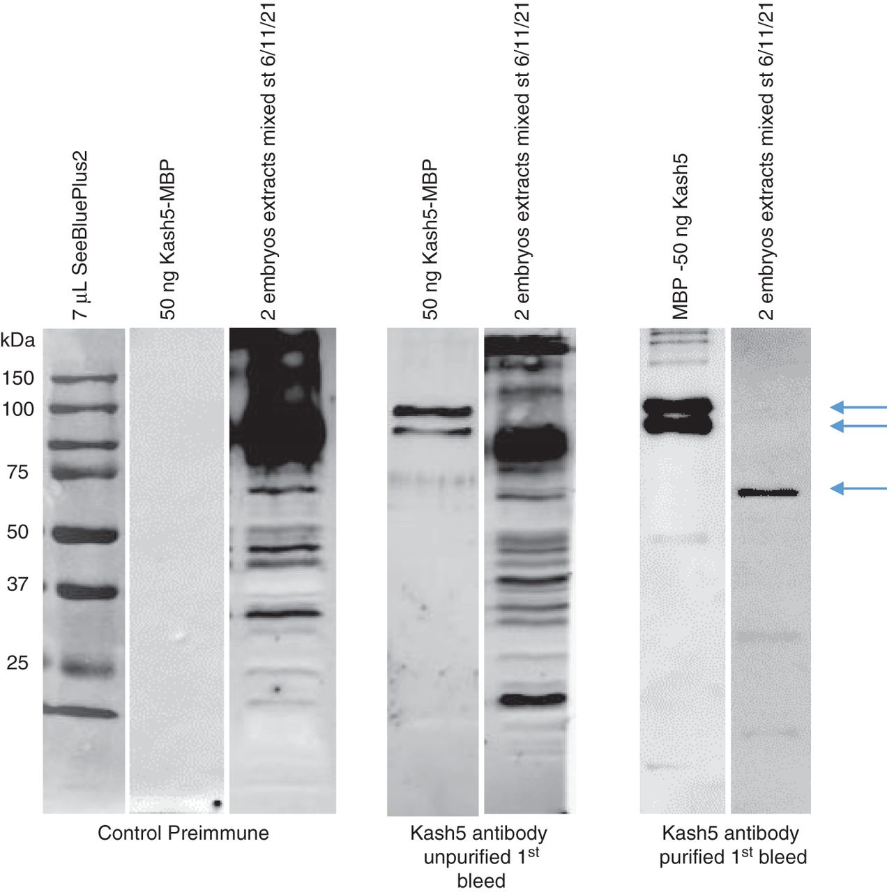 Western blot to test a purified Kash5 antibody. The three gels were run and treated under the same conditions, the only variable being the primary antibody used. Proteins from embryos at stages 6, 11, and 21 were isolated and run using extracts from two embryos per lane. The positive control, an MBP-Kash5 protein expressed in E.coli (calculated MW approximately 90 kDa) runs as two major bands at 90–95 kDa (upper arrows) while the native Kash5 from embryo extract runs as a single band at 59 kDa (lower arrow). The latter is only detected as a unique, clear band once the immune serum has been purified using the unpurified and purified forms of the antibody. MBP-Kash5 is not seen when the preimmune serum was used. The high background levels observed before purification of the antibody were minimized and Kash5 (bottom arrow at 59 kDa) was detected as a single protein of the correct size once the antibody was purified.