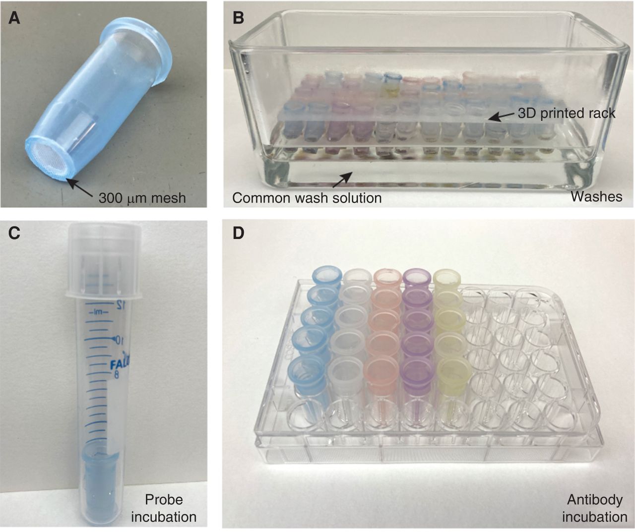 Basket format for higher-throughput staining. (A) Sample basket made from a 1.7-mL microcentrifuge tube (with cap and bottom cut off) with 300-µm mesh melted to the bottom. (B) Wash setup, with color-coded baskets arranged in a 3D-printed rack within a glass staining dish. Samples share a common wash buffer. (C) Probe incubation setup, in baskets within 15-mL round-bottom culture tubes with 500 µL of probe solution. (D) Antibody incubation setup within a 48-well culture plate with 500 µL of antibody solution in each well. These incubation setups allow for each sample to experience a different probe or antibody, if desired, and minimize the total volume required.