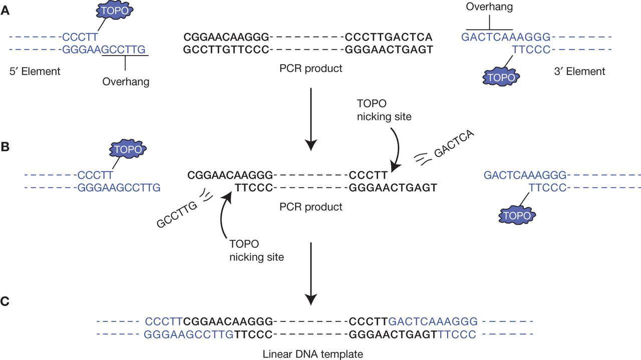 TOPO tools (PCMV/TetO 5′ element) for producing linear DNA constructs with defined 5′ and 3′ functional elements. (A) The 5′ and 3′ functional elements and the PCR product to which they are to be added are shown. Different 11-bp sequences (bold) are added to the ends of the PCR product via forward and reverse primers. (B) TOPO cleaves the PCR product, creating TOPO-activated overhangs (and the release of single-stranded 6-mers) complementary to the overhangs of the TOPO-activated functional elements. (C) Annealing the overhangs juxtaposes the 5′-OH of each to attack the phosphotyrosyl bond of the other, ligating both strands of each functional element to both strands of the PCR product, releasing two TOPO molecules, and creating a linear recombinant template for direct use in vitro and in vivo. (Reproduced from Invitrogen 2002, part of Life Technologies, 2002.)