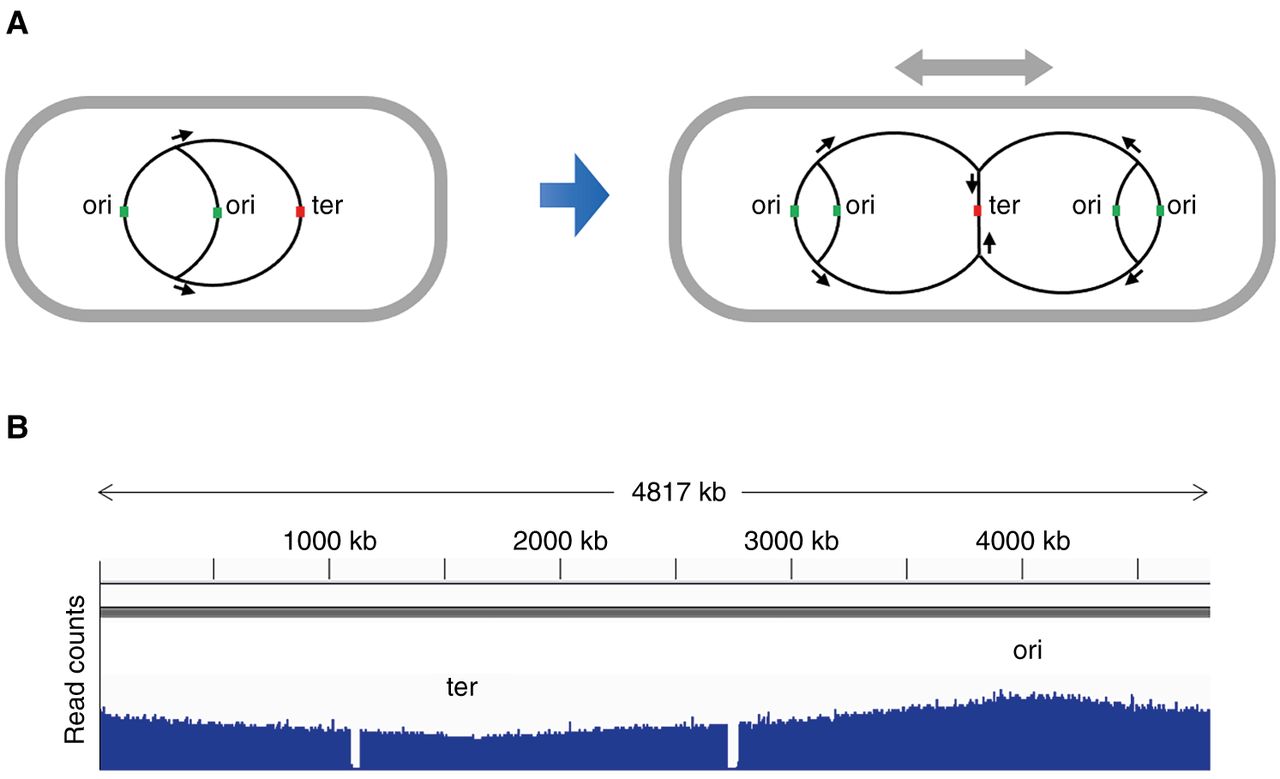Gene-dosage gradient in bacterial DNA replication. (A) Schematic diagram of the replicating chromosome during cell growth. (B) Read-count profile of randomly fragmented chromosomal DNA from exponentially growing Salmonella in a high-throughput DNA-sequencing experiment. (The two gaps in the profile correspond to the locations of two prophages missing in the strain used here.)