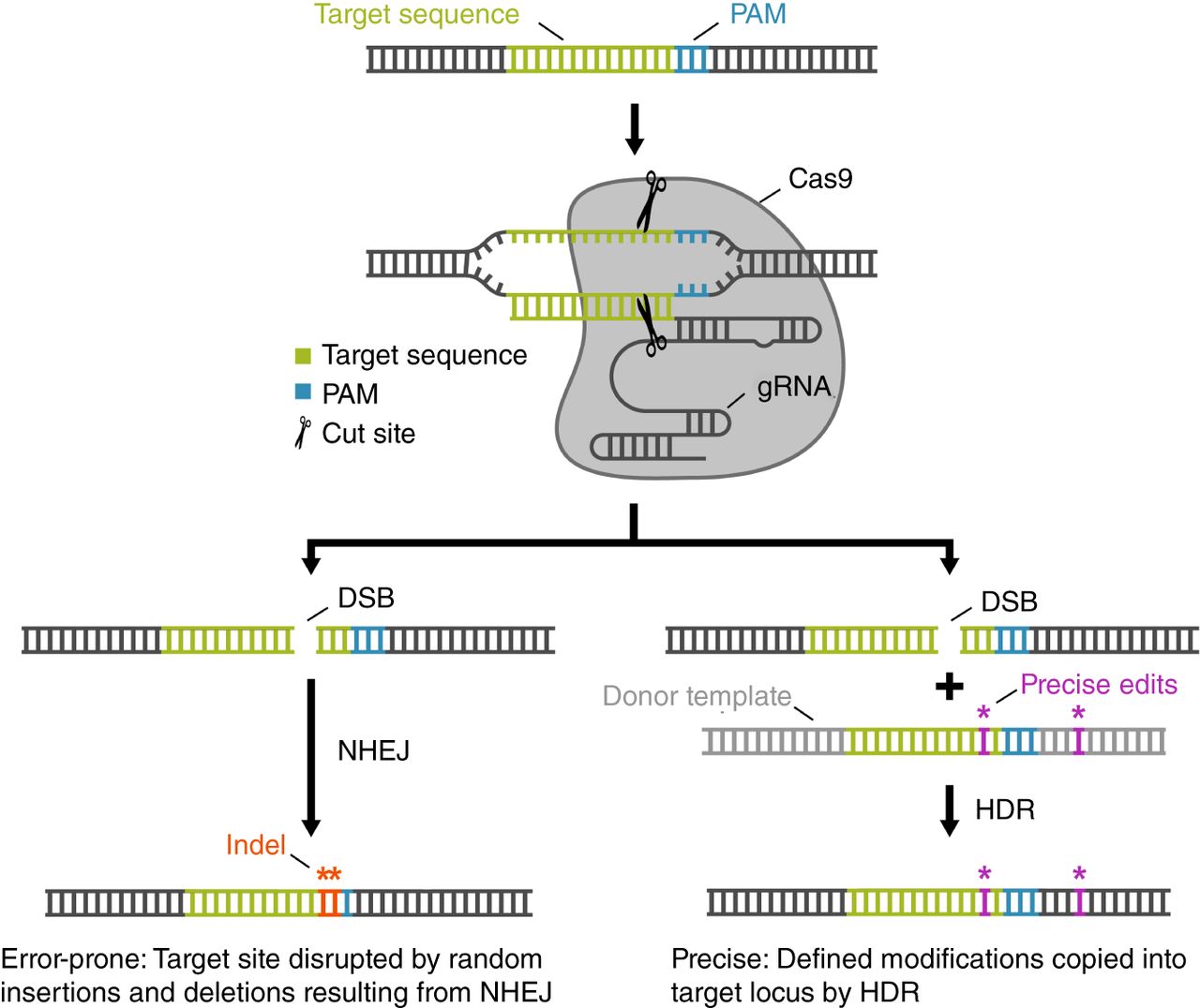 Gene editing with CRISPR–Cas9: components and DNA-repair pathways. The CRISPR–Cas9 gene-editing system uses two simple components to induce targeted double-stranded breaks (DSBs), the repair of which provides an opportunity to edit the genome. (Top) The Cas9 enzyme cleaves both strands of DNA using its two nuclease domains and a guide RNA (gRNA). As its name implies, the gRNA “guides” Cas9 to its target site, which must be adjacent to a 3′ protospacer-adjacent motif (PAM) for cleavage to occur. The widely used Streptococcus pyogenes Cas9 recognizes the PAM 5′-NGG. The first 21 nucleotides of a gRNA bind to the target site via standard Watson–Crick–Franklin base pairing. Upon binding, Cas9 generates a DSB 3 nt upstream of the PAM. (Bottom) DSBs are repaired by one of two general DNA-repair mechanisms: nonhomologous end-joining (NHEJ) and homology-directed repair (HDR). Both pathways are active in germ cells, and the experimenter has little control over which pathway the cell will use to repair the DSB. The NHEJ pathway (left) rejoins the broken ends through an error-prone mechanism that often results in the random insertion and deletion of DNA to generate mutations called indels that can be strategically targeted to disrupt genes and other sequences of interest. The HDR pathway (right) relies on templated repair of the break, which enables precise edits or exogenous DNA to be introduced. During HDR, DNA polymerase uses a template to synthesize DNA that will ultimately be incorporated into the genome. In cells, the template for repair is normally a homologous allele. In gene editing, the researcher supplies a “donor” template that contains desired edits flanked by sequences homologous to the two sides of the DSB (homology arms) that can be recognized by broken genomic DNA to initiate HDR.