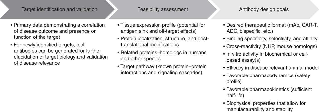 Development of an antibody discovery strategy. Listed are the major stages of preparation for the antibody discovery and development process, with factors for consideration at each stage to develop an antibody discovery strategy. See the text for details.