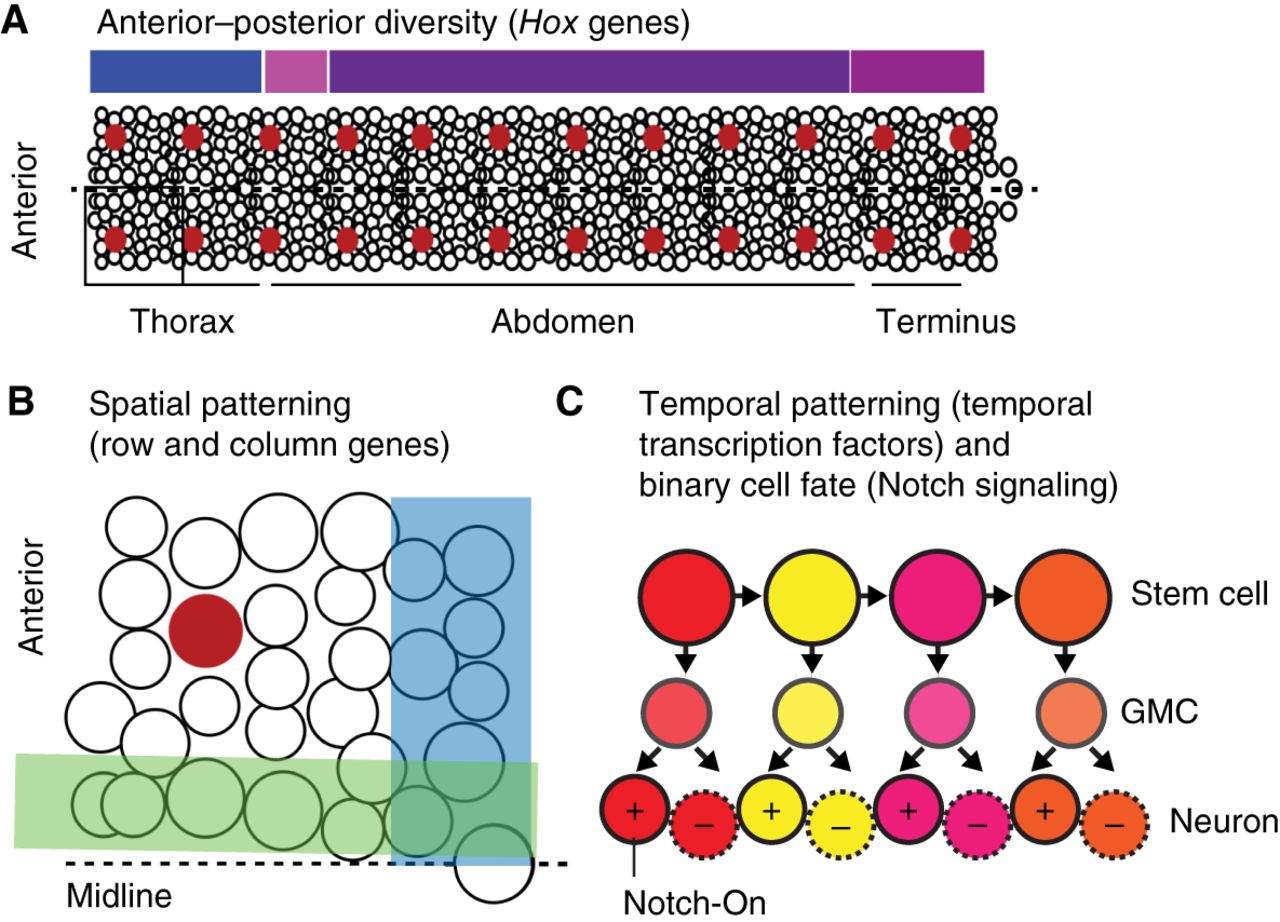 The generation of neural diversity in Drosophila nerve cord. (A) Neuroblasts are arrayed along the anterior–posterior axis. Each circle represents one neuroblast. The midline is represented by a dashed line. A representative neuroblast, NB3-3, is shown in red to highlight the left–right symmetrical and serially homologous organization of the nerve cord. An example of a nonrepeating unit, a hemineuromere, is shown in the box at the bottom left and is enlarged in B. Above the nerve cord, colored bars show approximate zones of Hox gene expression. Regions of the nerve cord are labeled below. (B) A single hemineuromere (box in A) is shown. Each neuroblast is distinct due to row and column gene expressions, which are represented by blue and green stripes. (C) The illustration shows neuroblast lineage progression. Each circle represents one cell, and each arrow represents a cell division. The top row contains neuroblasts that divide to self-renew and generate a ganglion motor cell (center row). (Bottom row) Ganglion mother cells (GMCs) divide asymmetrically to generate two neurons. Neurons become different from each other based on Notch signaling, with cells labeled with “+” representing Notch-On neurons and the others representing Notch-Off neurons. Temporal transcription factor expression in neuroblasts is dynamic, changing on each division, with each color representing a different temporal transcription factor. However, temporal transcription factors are maintained in the progeny generated at specific birth times (they keep their color).
