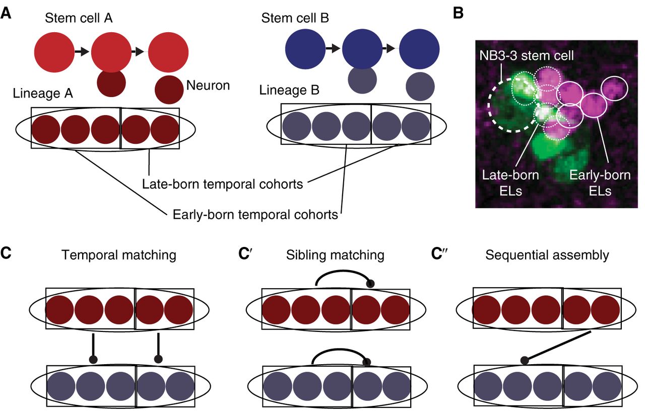 Stem cell lineages are organized into temporal cohorts in Drosophila. (A) In this illustration, stem cell A (red) and stem cell B (blue) generate two distinct lineages (ovals) of neurons. Both lineages are subdivided into temporal cohorts (boxes). Each circle represents a cell, with arrows representing cell division. (B) An image shows early-born and late-born Even-skipped (Eve)-expressing lateral (EL) neurons (small circles, each ∼3 µm in diameter) from the NB3-3 stem cell (large dashed circle at left). This late-stage embryo was stained with an anti-Even-skipped antibody (magenta) to label all EL neurons (small circles) and costained with anti-GFP (green). In this embryo, GFP expression is being driven by an enhancer, “11F02” (genotype: 11F02-GAL4 > UAS-nls-GFP). (C) Lineages can be connected to each other in different patterns. Symbols are as in A and, additionally, the line with a dot on the end represents synapses between neurons of one temporal cohort and another temporal cohort. In temporal matching, early-born neurons and late-born neurons from different lineages synapse with each other. (C′) In sibling matching, neurons from the same lineage synapse with each other. (C″) In sequential assembly, neurons from a late-born temporal cohort in one lineage synapse with neurons from an early-born temporal cohort in a second lineage. Because neurons make multiple connections, these models are not mutually exclusive.