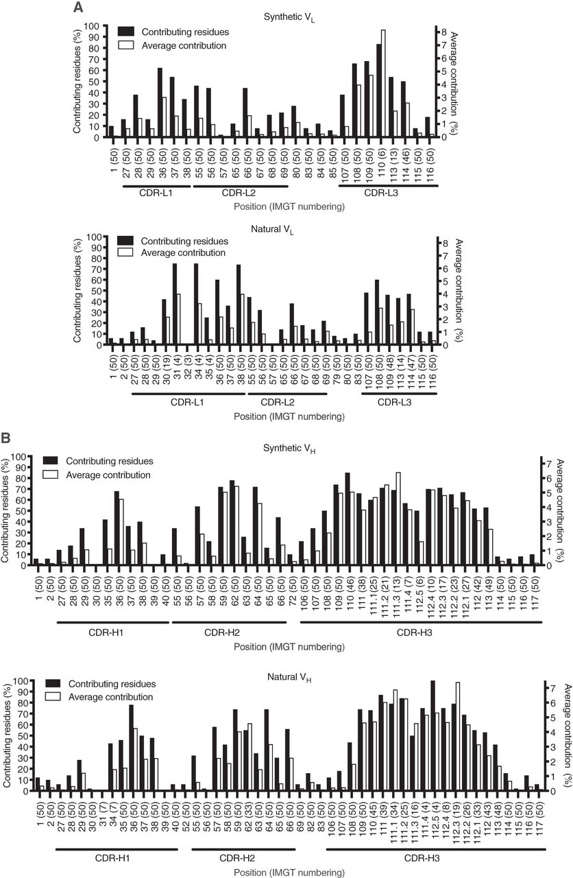 Relative contributions of antibody (Ab) residues to the structural paratope for the analyzed synthetic and natural Abs. Data are plotted for light-chain variable (VL) domains (A) and heavy-chain variable (VH) domains (B). At each position (x-axis), the black bars (left y-axis) show the percentage of contributing residues (contributing residues %), and the white bars (right y-axis) show average relative contribution to binding interface (average contribution %). The contributing residue percentage was calculated by dividing the number of structures with ≥0.5% relative contribution to the structural paratope at position X by the total number of structures available for position X. Average contribution percentage was obtained by calculating relative contribution to the structural paratope at position X for each structure and then averaging these values. Note that the relative contribution values for each position are not normally distributed but follow a strong positive skew distribution, with a significant proportion of values being 0 and standard deviations exceeding the average values. Thus, the average values shown are not meant to represent the most observed values for a given position but rather provide some measure of comparison between synthetic and natural data sets. Only positions with the contributing residues ≥5% and that have residues in ≥5% of structures are shown. Complementarity-determining regions (CDRs) are indicated and are defined as the continuous stretches of amino acids containing positions that contribute to the structural paratope in ≥5% of structures analyzed. The total number of structures that contain a residue at a given position is indicated in parentheses. Positions are numbered according to the IMGT nomenclature (Lefranc et al. 2003).