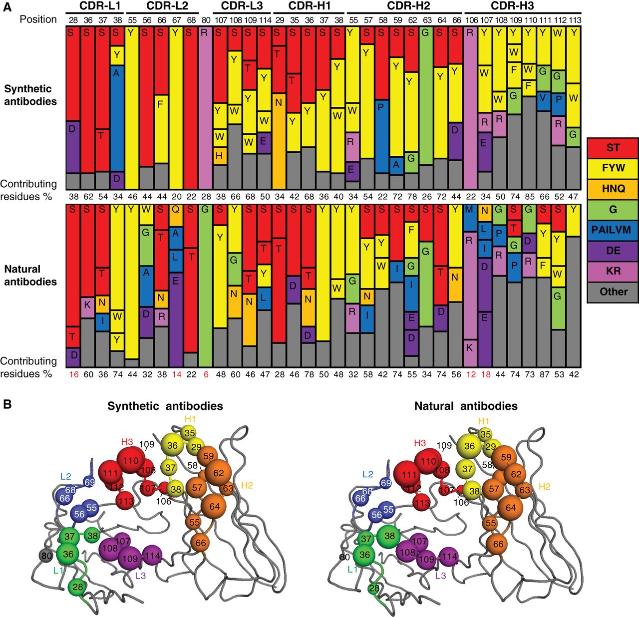 Core structural paratope of the analyzed synthetic antibodies (Abs). The core structural paratope of the analyzed synthetic Abs was defined as positions that are present in ≥60% of the selected structures and contribute to antigen recognition in ≥20% of the structures. The same positions in natural Abs are shown for comparison. (A) For each position in the core structural paratope of synthetic Abs, the amino acid distributions are shown for synthetic Abs (top) and natural Abs (bottom). Amino acids that are present at ≥10% frequency are shown separately (colored bars), whereas amino acids present at <10% frequency are grouped together as “other” (gray bars). The length of each bar is proportional to the frequency, and the total length of the bars at each position is equal to 100%. (B) The core structural paratope of synthetic Abs mapped onto the structure of the trastuzumab antigen-binding fragment (Fab) (Protein Data Bank entry 1N8Z). The size of each sphere is proportional to the frequency at which residues at that position contribute to antigen recognition in synthetic Abs (left) and natural Abs (right).