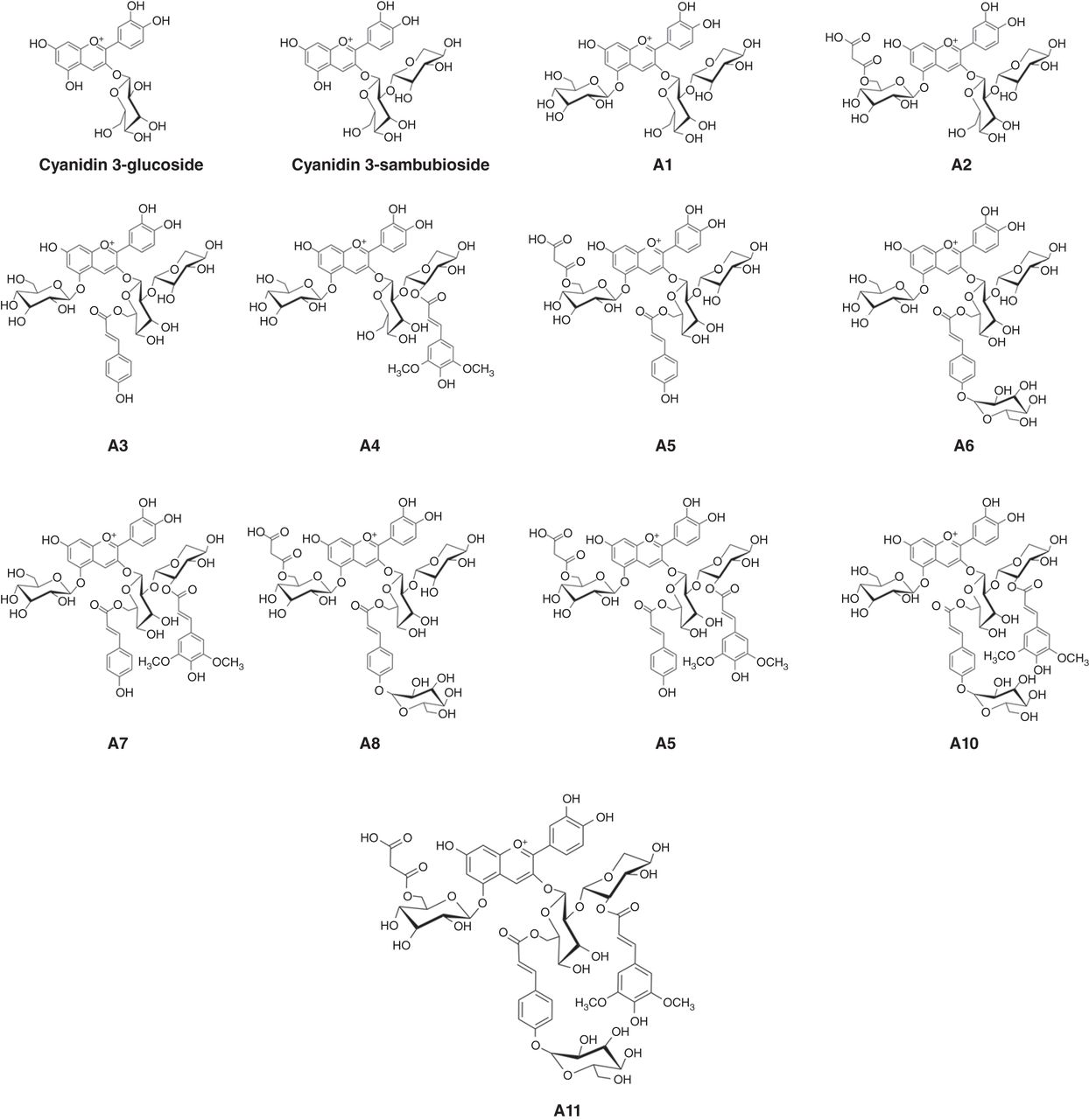 Complexity of modifications that characterize anthocyanins. Shown are the many anthocyanins that have been described in Arabidopsis, as an example. The naming of the anthocyanins is according to Tohge et al. (2005).