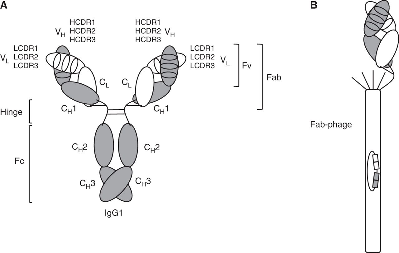 IgG1, Fab, and Fab-phage. (A) Depiction of an ∼150-kDa IgG1 molecule with the two ∼25-kDa light chains shown in white and the two ∼50-kDa heavy chains shown in gray. Each of these chains (light and heavy) comprises an N-terminal variable domain (VL or VH, respectively), each having three complementarity determining regions (CDRs), followed by one constant domain in the light chain (CL) and three constant domains in the heavy chain (CH1, CH2, and CH3). VL/VH and CL/CH1 heterodimerize, and CH3/CH3 homodimerizes. The glycosylated CH2 domain does not dimerize. The hinge region between CH1 and CH2 includes four interchain disulfide bridges: two between the heavy chains and two between heavy and light chains. The VL/VH heterodimer is also known as “fragment variable” (Fv), and the combined VL/VH and CL/CH1 heterodimer is known as the “fragment antigen binding” (Fab). The hinge region connects the two Fab arms of the IgG1 molecule to the “fragment crystallizable” (Fc). (B) Depiction of a Fab-displaying filamentous phage in phagemid-based phage display systems. Note the preserved C-terminal disulfide bridge between the light chain and heavy chain fragments. The Fab is fused to the N terminus of a C-terminal fragment of minor coat protein pIII and forms, together with four wild-type pIII copies, the spiky cap of the filamentous phage particle. The phagemid encapsulated by the filamentous phage particle encodes the displayed Fab, affording the physical linkage of genotype and phenotype.